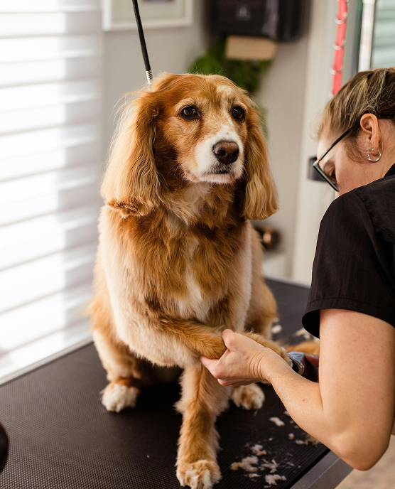 Our complete grooming service keeps your pet looking and feeling their best. This full-service experience typically includes bathing, drying, brushing, coat trimming or styling, nail trimming, ear cleaning, and a final tidy. Each session is tailored to your pet’s breed, coat type, and comfort level for a calm, stress-free visit.